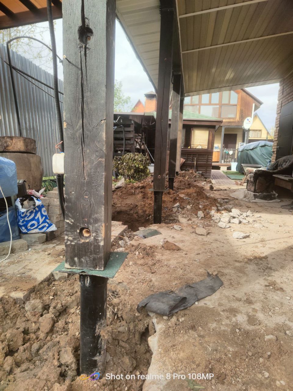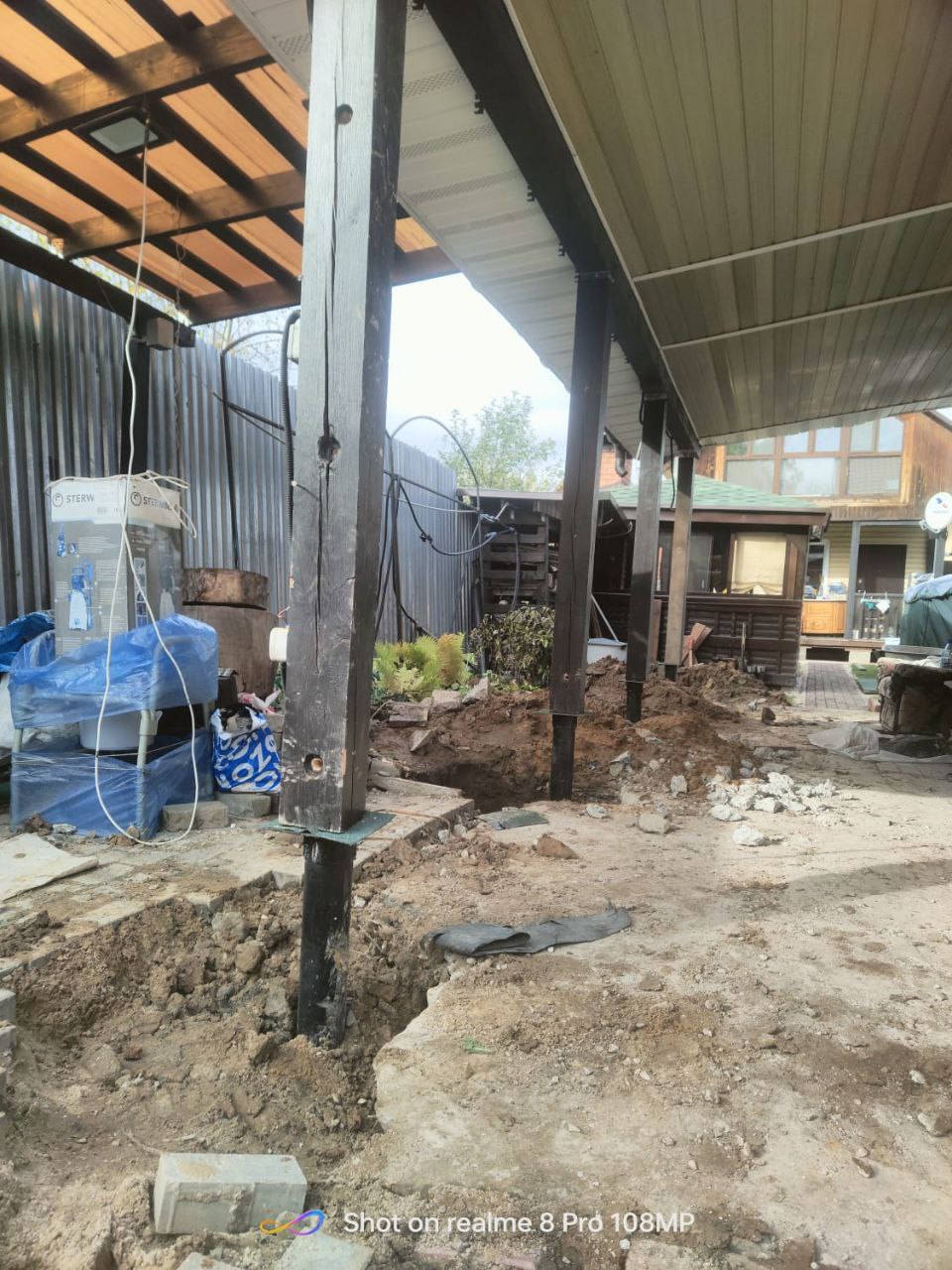 —Выдавило тумбы под опорами навеса - заменили на винтовые сваи